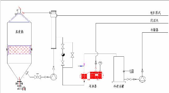 在制浆系统中大量使用蒸汽及蒸汽换热系统,以往的设计中,山东泉林纸业公司均使用热动力式疏水阀装置,效果良好。在新项目设计过程中,一如既往地采用了热动力式疏水阀,只是简单地调整了能力大小。新选型为普通热动力式DN80疏水阀,系统一运行,疏水阀后续工段再沸器排气装置不能满足排气要求,超出了设计范围,再沸器压力急剧上升,致使疏水阀背压上升,造成大量蒸汽泄露。设计流程如图1。