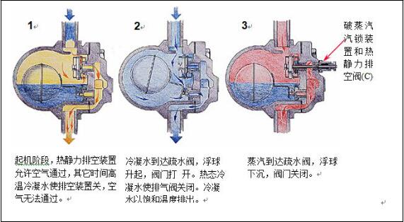 当冷凝水进入疏水阀时,浮球上升,排水口打开,疏水阀排水;由于排水口关闭时在水位以下,冷凝水产生水封作用,由此确保不会发生蒸汽泄漏;同时,浮球式疏水阀内置自动排空气阀,可以在启动时提供双倍冷凝水排量,有效排出管道内的热阻很大的空气,大大加快暖管以及蒸汽系统的启动时间;浮球疏水阀可以用于换热设备以及管道疏水,应用广泛。浮球疏水阀的工作过程如图2。