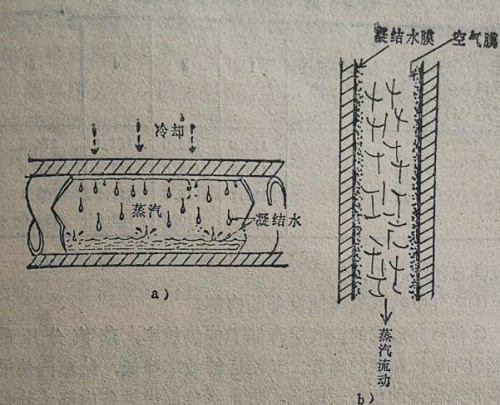 设备内蒸汽的潜热使被加热物加热,蒸汽则冷却,凝结成水,疏水阀在管壁周围形成凝结水层(参看图2a)。但是,若设备内部-一旦混入空气,由于空气是不可凝气体(即不能液化),所以设备内管壁上的凝结水层内侧又形成空气层参看图2b),且空气的热导率极小,比保温材料还小,因而,使蒸汽和被加热物之间的热交换能力显著降低。