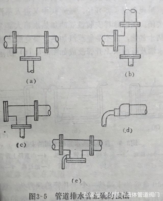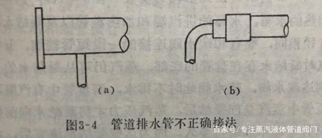 排水点的结构很重要,图3-4所示的排水方法不正确。如图3-4(a),因蒸汽流速达30~40m/s,凝结水不可能流入小孔排出;图3-4(b)是管道末端的排水水管。因凝结水必须满到小管口才有凝结水流入水管。