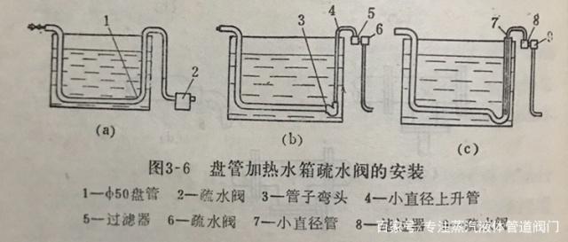 在直径50盘管的末端接一个上升管鹅颈弯头。这样,在盘管中积水前就在这一弯头中造成水封。上升管的直径也改为如图3-6(b)中的细管,这不但减少汽阻的体积,而且也容易维持上升管中的水柱,不使蒸汽通过。疏水阀尽可能安装得靠近上升管。在疏水阀前需加装过滤器。