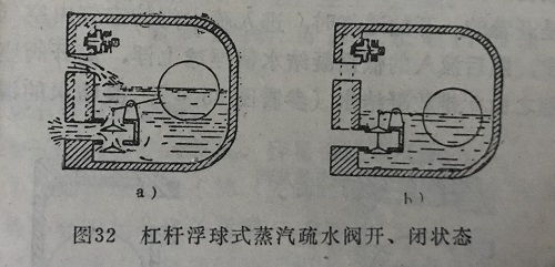 杠杆浮球式疏水阀开始通气时,阀体上部的自动空气排放阀打开,空气迅速排出。低温凝结水流入时,浮球上浮,打开阀门排除凝结水,凝结水的温度逐渐上升。当凝结水的温度接近饱和温度时,自动空气排放阀关闭,凝结水流入疏水阀,使浮球保持上升的位置,并继续保持开阀状态(参看图32a)。如果凝结水停止流入,则浮球下降,并关闭阀门(参看32b)。